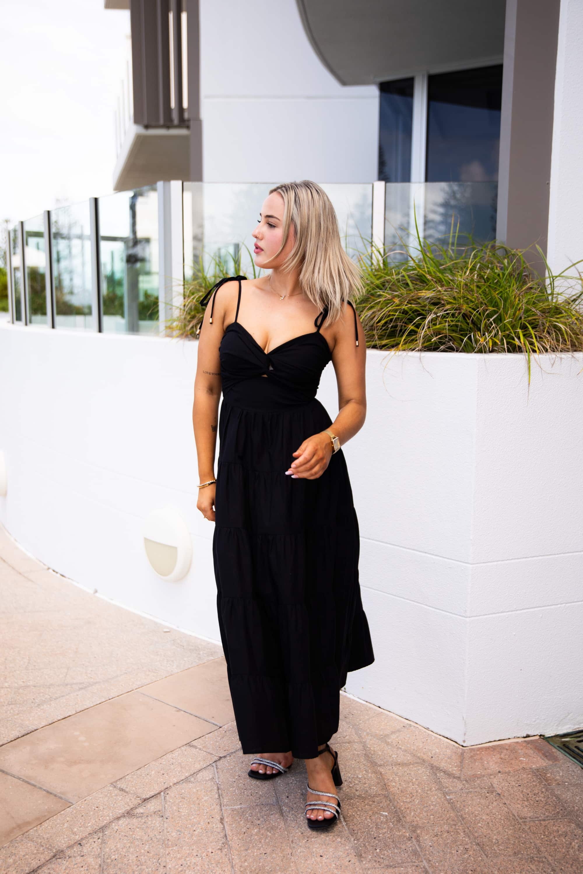 Step into elegance with The Notebook Dress in Black. This stunning dress features a fitted bodice for a flattering silhouette and a flowing skirt that moves with grace. The adjustable tie straps add a touch of charm and allow for a customized fit. Perfect for any occasion, this dress combines timeless style with contemporary comfort.