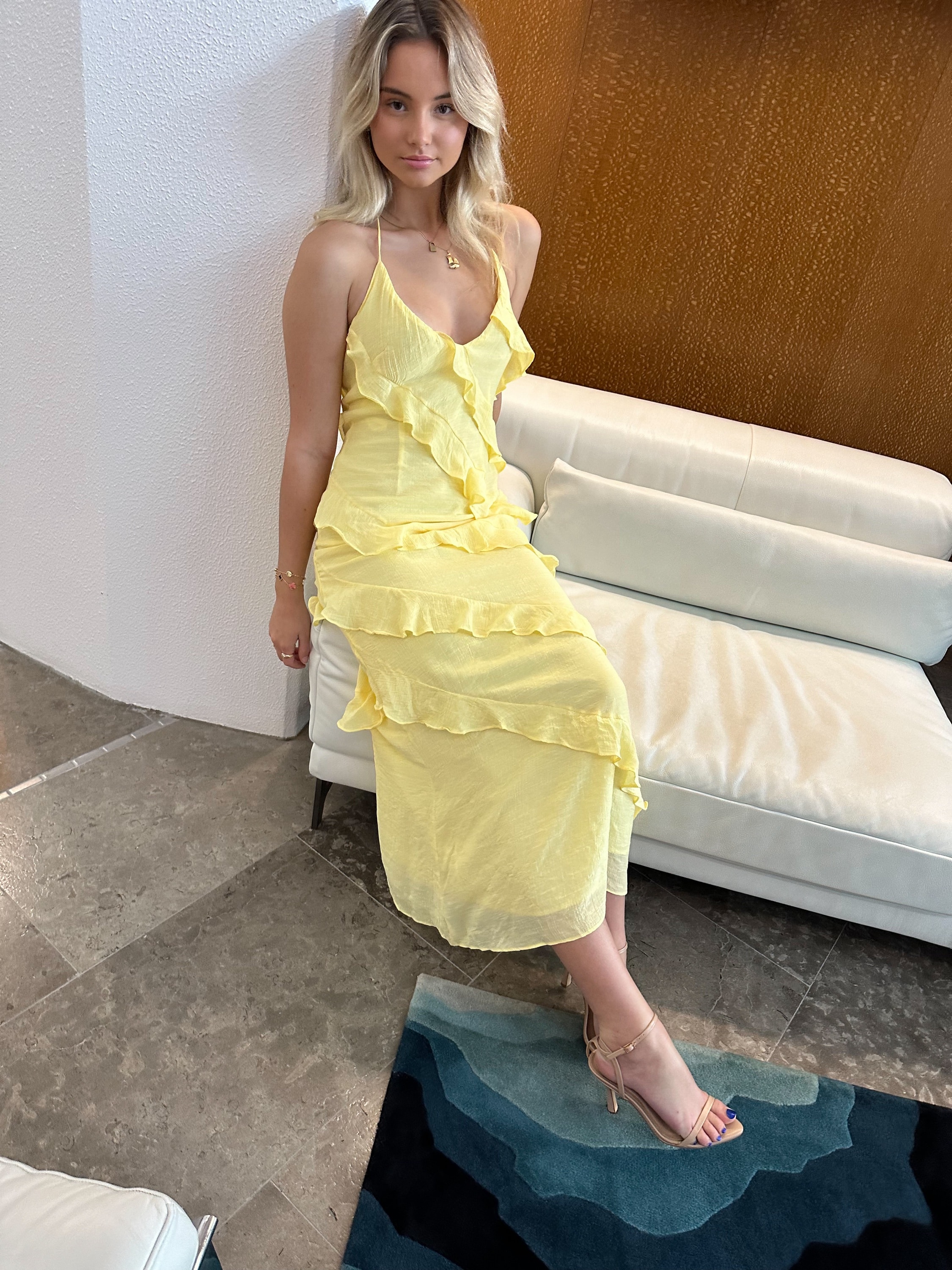 The Popular Vista Dress In Yellow. This stunning dress features elegant ruffles that add a touch of femininity and a stylish halter neck for a flattering silhouette. Perfect for sunny days, it exudes a bright, cheerful vibe that is sure to turn heads at any event. Ideal for casual outings or dressier occasions.